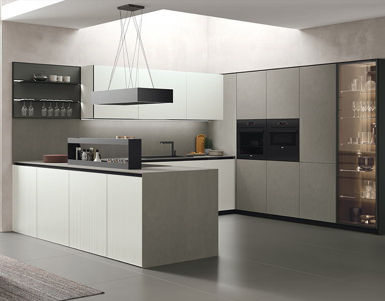 - Ideale per chi ha poco spazio e vuole concentrare tutte le principali funzioni in un’unica area. La zona di cottura viene inserita direttamente sulla penisola, magari con una cappa sospesa per eliminare gli odori. È una soluzione moderna e funzionale, perfetta per chi desidera un design minimale e lineare.