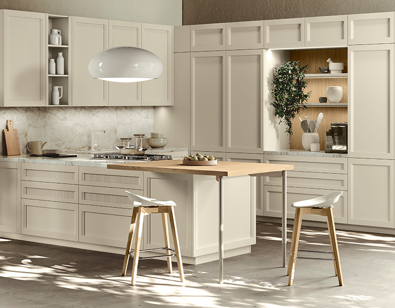 3) Le sedute imbottite in tessuto o pelle aggiungono comfort senza compromettere lo stile della cucina classica.