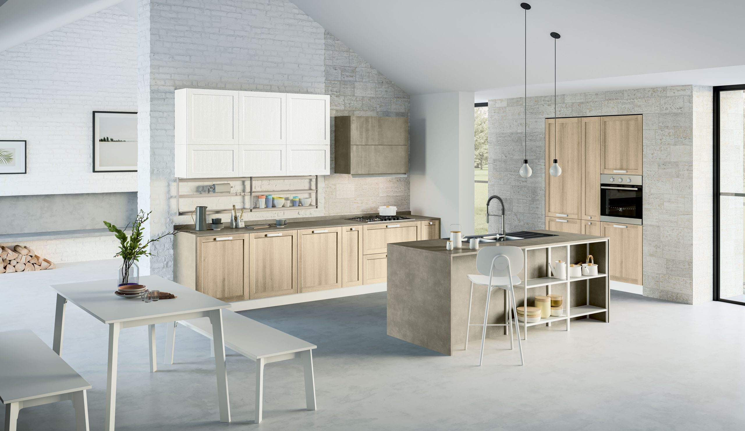 Sveva è caratterizzata da ante a telaio, realizzate con materiali e colori che si rifanno a suggestive atmosfere tattili ed emotive della natura, che vengono abilmente accostate alle ante lisce del modello Kaya per progettare ambienti conviviali e unici.